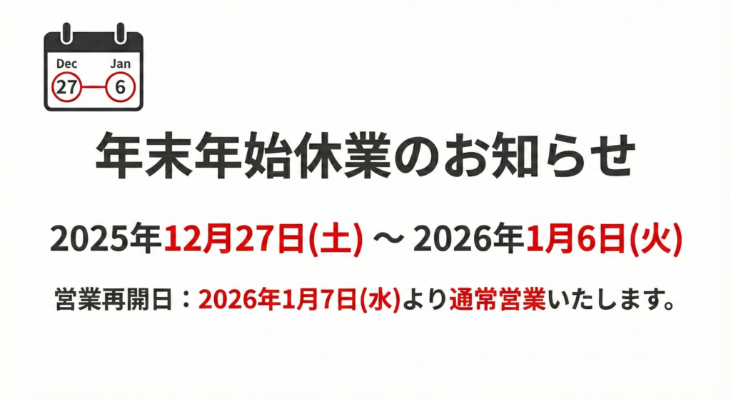誠に勝手ながら、以下の期間を年末年始期間の営業時間変更とさせていただきます。